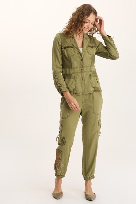 108.00$Flattering seaming and ruching at the front leg brings plenty of curve-conforming detail to this soft twill, banded leg pant. A contrast rib pull-on elastic waistband and cargo pockets with twill tape and antique brass hardware details finish off this style. Taissa Twill: 70/30 Rayon/Tencel 2×1 Rib Waistband: 48/48/4 Cotton/Modal/Spandex…