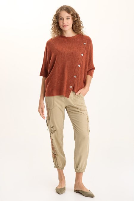 105.00$Flattering seaming and ruching at the front leg brings plenty of curve-conforming detail to this soft twill, banded leg pant. A contrast rib pull-on elastic waistband and cargo pockets with twill tape and antique brass hardware details finish off this style. Taissa Twill: 70/30 Rayon/Tencel 2×1 Rib Waistband: 48/48/4 Cotton/Modal/Spandex…