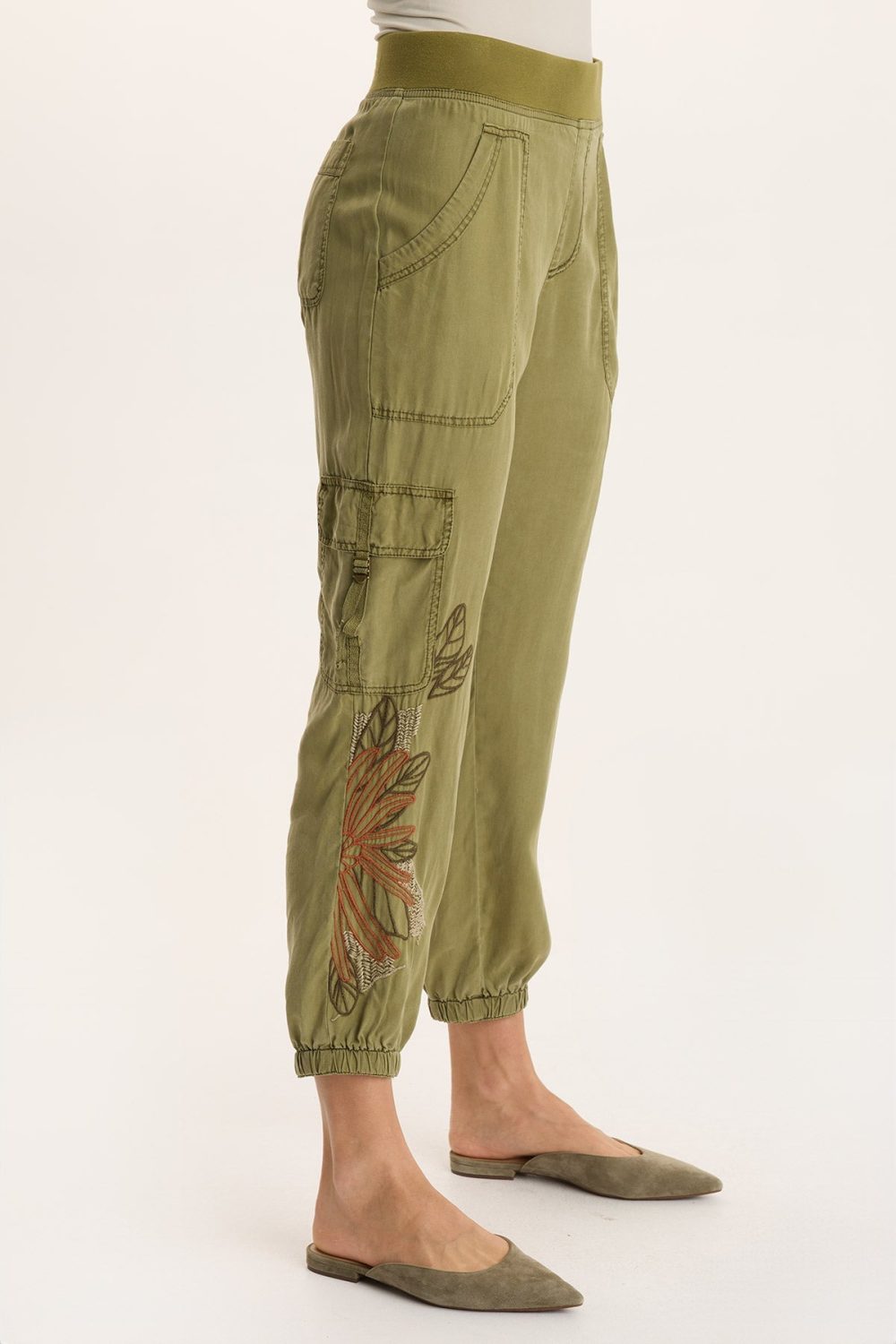 A pull-on faux fly style with tabbed cargo pockets on either side, deep hip pockets, and traditional jogger banding at the cuff, Darri gets an unexpected artisan touch with contrasting floral embroidery detail on the leg.